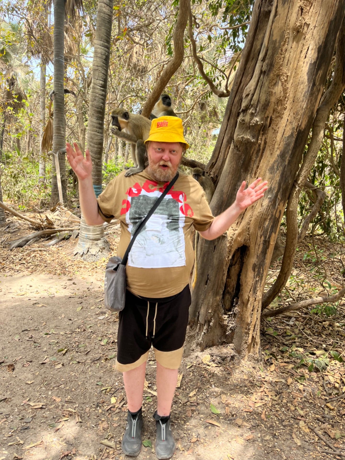 Menimme apina puistoon. Siellä oli kahden tyyppisiä apinoita. Toiset söivät banaaneja ja toiset pähkinöitä. Ostimme 100 GMD banaaneja ja 100 GMD pähkinöitä. Banaanit laitettiin paloiksi ja pähkinät pussiin. Niitä oli runsaasti apinoiden ruokkimista varten. Saimme mukaan oppaan joka puhui englantia. Hän kertoi apinoista tarkemmin ja ohjasi kuinka saisimme ruokkia niitä niin, että ne tulivat olkapäiden ja pään päälle syömään. Juju oli siinä ettei katsonut niitä ja olin asennossa, jossa apinat eivät kokeneet minua uhaksi. Parhaimmillaan olin kolmen apinan kanssa seisomassa puun vieressä. Otimme paljon kuvia apinoista syömässä banaaneja ja pähkinöitä.